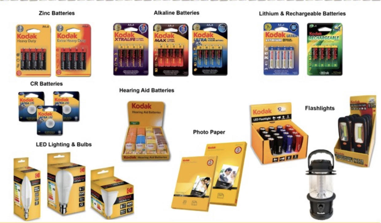 Manejamos varias licencias de Kodak siendo las mas grandes Baterías, Bombillas Leds, Linternas, Lámparas, Rasuradoras desechables y cartuchos, papel y toda la linea para móviles